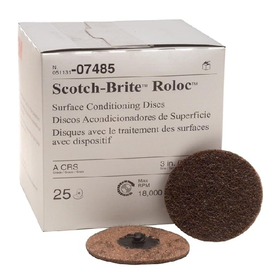 The 3M 7485 3” Roloc Coarse Surface Conditioning Disc, Brown (07485), is a high-performance abrasive tool for professional surface preparation, cleaning, and finishing. It features durable non-woven nylon construction combined with aluminum oxide abrasive mineral. This design ensures consistent performance and provides a uniform finish on various materials, including metal, stainless steel, and aluminum.