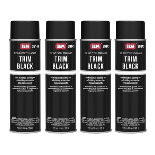 Ultimately, the SEM 39143 Trim Black Aerosol is your go-to solution for restoring faded automotive trim. It combines a factory-look finish, excellent adhesion, and exceptional weather protection — all in an easy-to-use 4-pack.